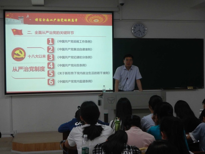 本次授课的主要内容包括中国共产党的发展历史和党的方针政策解读两部分。课上,沈又红博士结合现实中的例子和最近热播的电视剧《人民的名义》,分析了党员干部的贪污腐败问题和懒政怠政问题,指明了从严治党是维护执政安全的必然选择。此外,沈又红博士还为同学们解析了党的两大课题:如何提高党的领导水平和执政水平,以及如何提高党员的拒腐防变和抵御风险能力。最后,沈又红博士对2016级全体同学提出了美好希冀,课程也在同学们的掌声中圆满结束。
