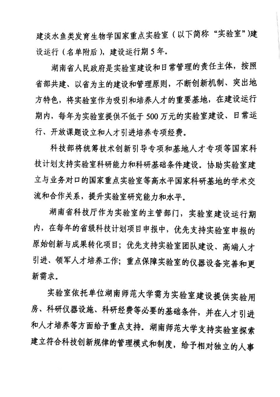 根据《科技部湖南省人民政府关于批准建设省部共建淡水鱼类发育生物学国家重点实验室的通知》,湖南省人民政府作为实验室建设和日常管理的责任主体,将把实验室作为吸引和培养人才的重要基地,在建设运行期内,每年为实验室提供不低于500万元的实验室建设、日常运行、开放课题设立和人才引进培养专项经费;科技部将统筹技术创新引导专项和基地人才专项等国家科技计划支持实验室科研能力和科研基础条件建设,协助实验室建立与业务对口的国家重点实验室等高水平国家科研基地的学术交流和合作关系,提升实验室研究能力和水平;湖南省科技厅作为实验室的主管部门,实验室建设运行期内,在每年的省级科技计划项目申报中,优先支持实验室申报的原始创新与成果转化项目,优先支持实验室团队建设、高端人才引进、领军人才培养工作,重点保障实验室的仪器设备完善和更新需求;我校作为实验室依托单位,将为实验室建设提供实验用房、科研仪器设施、科研经费等必要的基础条件,在人才引进和人才培养等方面给予重点支持,并支持实验室探索建立符合科技创新规律的管理模式和制度,给予相对独立的人事决定权;实验室将按照专家论证通过的《省部共建淡水鱼类发育生物学国家重点实验室建设运行实施方案(2016-2020)》,开展具有区域特色的基础研究、应用基础研究和竞争前关键技术研究,提升区域科技创新能力,服务地方经济发展,同时根据《省部共建国家重点实验室管理办法(试行)》的要求,坚持高标准建设目标,建立健全运行管理机制,加强人才队伍培养,加强实验条件建设,加强开放合作,提升自主创新能力,成为组织高水平科学研究、聚集和培养优秀科研人才、开展学术交流的重要基地。