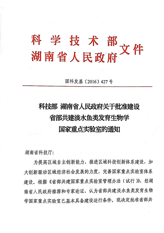 (记者 粟用湘 卢映红)2016年12月28日,科学技术部和湖南省人民政府批准依托我校建设省部共建淡水鱼类发育生物学国家重点实验室(以下简称“实验室”)。2017年1月16日,《科技部湖南省人民政府关于批准建设省部共建淡水鱼类发育生物学国家重点实验室的通知》(国科发基[2016]427号)印发。这是国内第一家以“鱼类”命名的国家重点实验室,也是我省首个省部共建国家重点实验室。