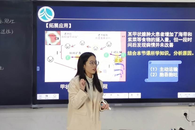会议包含教学展示、集中评课、实习队总结三个环节。此次汇报课课题为《主动运输和胞吞、胞吐》。张译元通过导入同学们所熟悉的地方性甲状腺肿的话题,并以甲状腺滤泡细胞吸收碘为例来引发学生的认知冲突,激发学生的学习兴趣。她引导学生运用科学探究的一般方法自主合作,并通过呈现甲状腺球蛋白参与甲状腺激素合成的具体过程,向学生阐述了胞吞胞吐的过程及其对细胞生命活动的意义。张译元还以甲状腺肿等疾病的治疗为题倡导学生在以后的学习和生活过程中不断创新,履行社会责任。