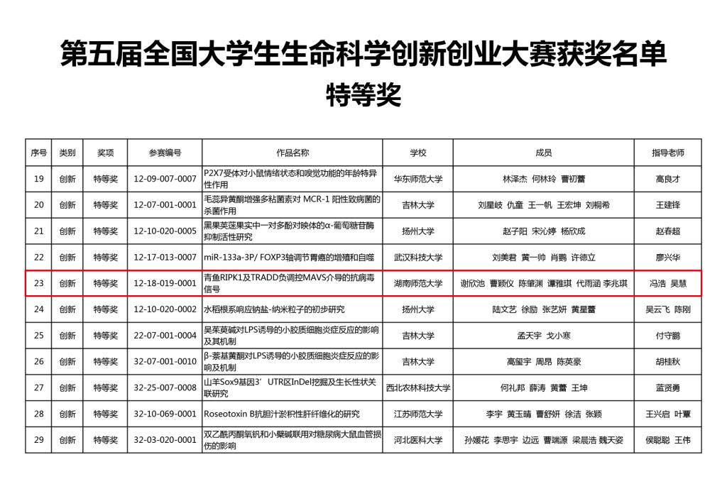 近日,第五届全国大学生生命科学创新创业大赛评审结果揭晓,伟德国际victor1946冯浩、吴慧指导,本科生谢欣池、曹颖仪、陈肇渊、谭雅琪、代雨涵、李兆琪的参赛作品“青鱼RIPKI及TRADD负调控MAVS介导的抗病毒信号”荣获特等奖。