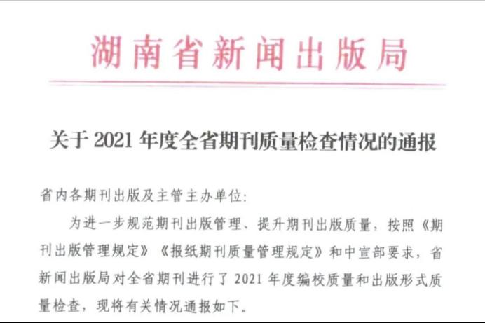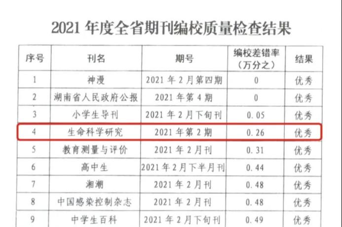 (供稿 生命科学研究杂志)近日,湖南省新闻出版局《关于2021年度全省期刊质量检查情况的通报》公布了2021年度全省具有国内统一连续出版物号且正常出版的248种期刊的编校质量抽查结果,42种期刊的检查结果为优秀(差错率不超过1/10000),占比16.9%,其中《生命科学研究》的差错率仅0.26/10000,居伟德bv1946主管或主办的15种期刊之首,同时名列全省248种期刊第4位(前2%)。