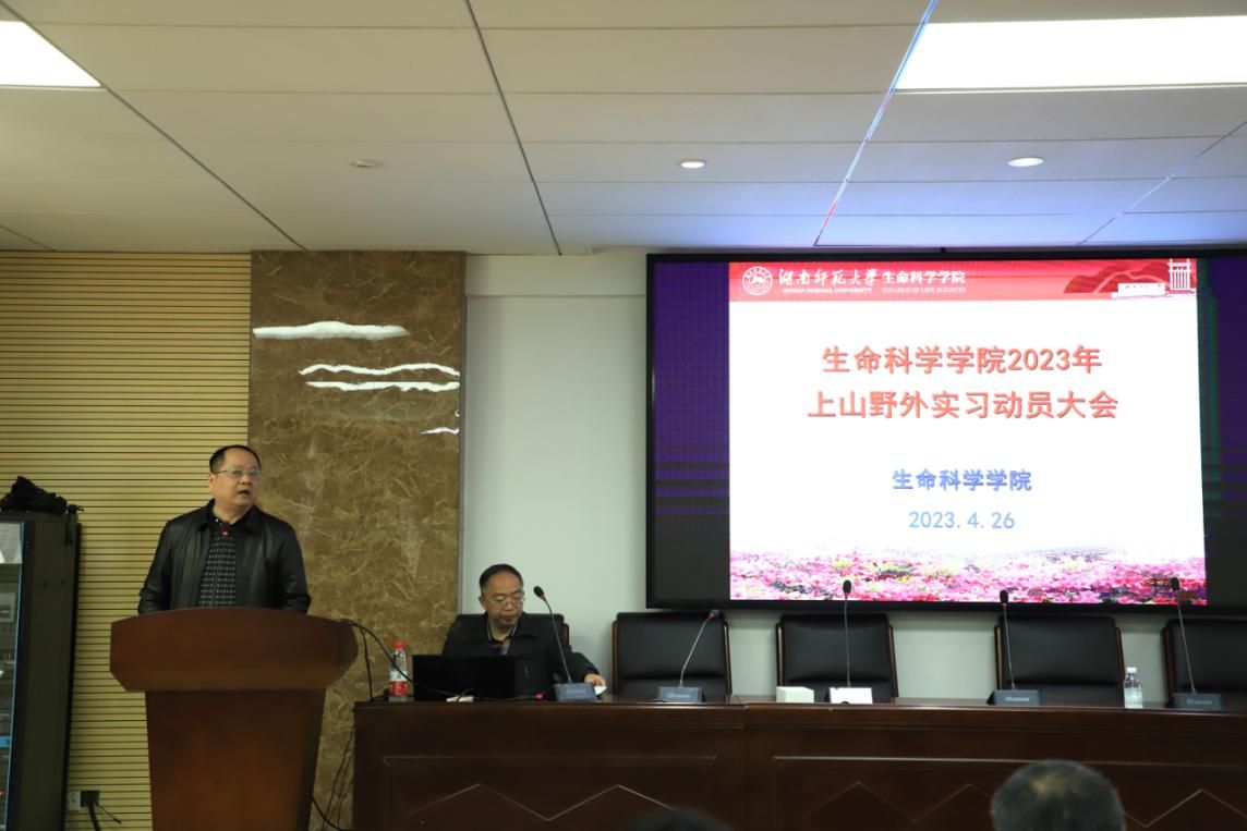 (通讯员 龙婵 冯鑫 龙欣然)4月26日中午,生科院于生科院B栋307学术报告厅举行2023年上山野外实习动员大会。生科院党委副书记彭赛丰、生科院副院长兼生物学实验中心主任陈湘定、昆虫学指导老师周琼、吴葩、彭威、脊椎动物学指导老师莫小阳、李建中、王斌、植物学指导老师李东屏、张平、丛义艳、旷仁平、潘柏含、王鹏、黎维平、教务办王晓燕主任、本部学工办刘迎彬以及树达学工办孙一心出席此次会议。李建中担任此次会议主持人。