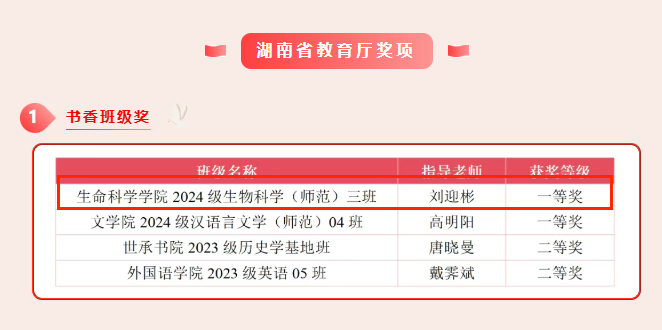 集体奖项中,刘迎彬老师指导的2024级生物科学(师范)三班荣获湖南省教育厅“书香班级奖”一等奖;学院申报、周冲老师牵头,姚欣彤与罗艺协作完成的《“三维共育”:“书香寝室”育人模式的探索与实践》案例,成功获评湖南省高校图工委“创新案例奖”。个人奖项方面,赵洛希同学斩获湖南省教育厅“优秀读书报告奖”二等奖,一众佳绩尽显我院师生深耕阅读、以读修心的良好风貌。