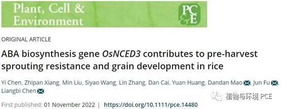 近日,伟德bv1946生命科学院陈良碧、毛丹丹研究组和湖南农平高科亚华种业科学研究院傅军研究组合作在Plant, Cell & Environment 上发表了题为“ABA biosynthesis gene OsNCED3 contributes to pre-harvest sprouting resistance and grain development in rice”的研究论文,揭示了水稻种子休眠调控关键基因OsNCED3的遗传机制。