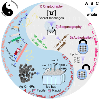 Scheme 1.(左)基于顺序合成双金属银铬纳米粒子的多通道传感、逻辑计算和三位一体的信息保护;(右)基于FSCN的金属离子多通道比色传感和高级分子信息保护。