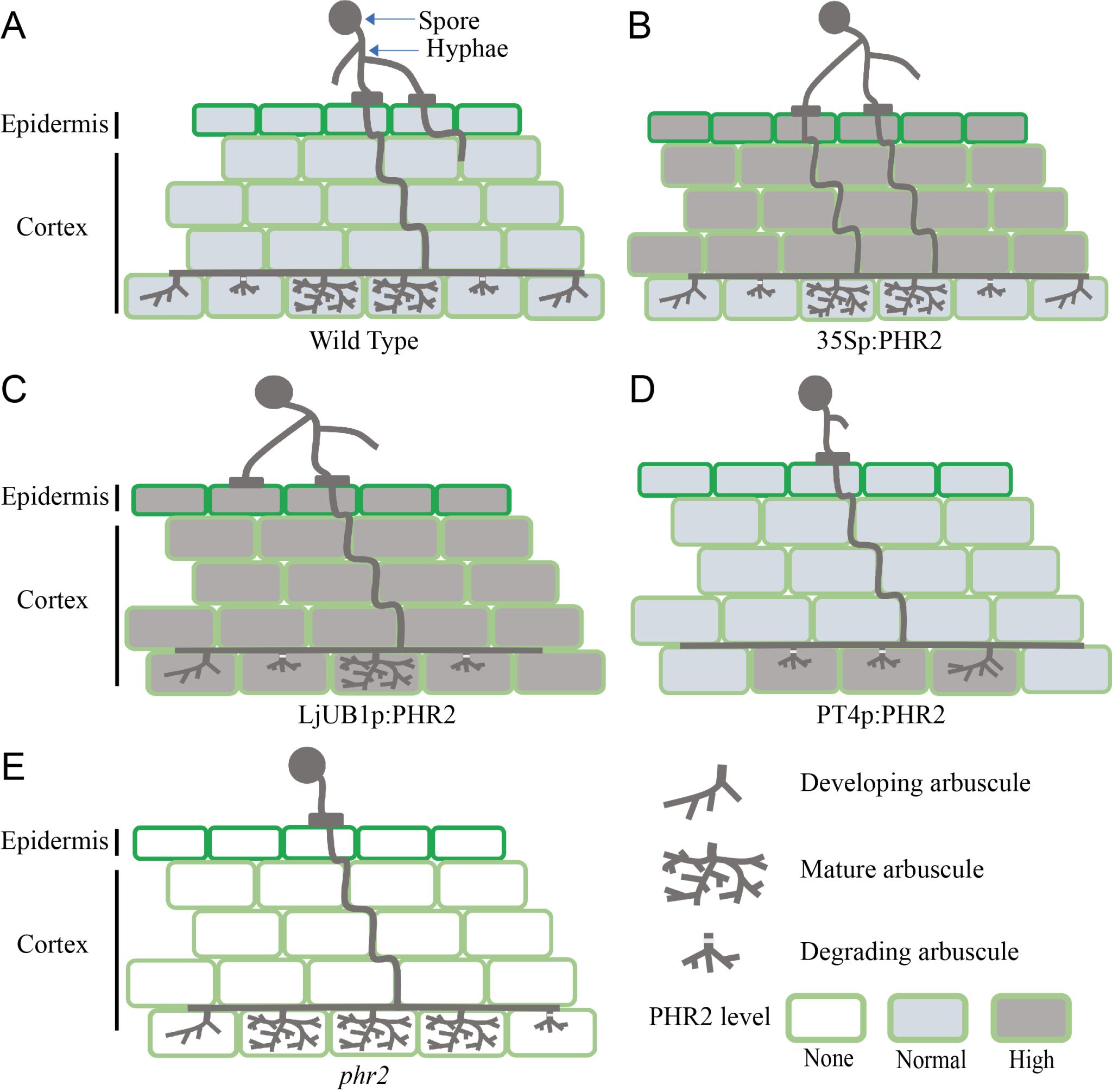 磷是植物生长所必须的大量元素。大部分陆生植物(~80%)具有两条吸收磷的途径,一是通过根表皮和根毛上的磷转运蛋白直接吸收根际周围土壤中的磷酸盐。二是与丛枝菌根真菌共生,利用菌根真菌的菌丝来吸收更远处土壤中的磷,提高植物吸收磷营养的效率。丛枝结构是菌根真菌与宿主植物进行营养交换的主要场所。前人研究表明PHR转录因子在磷直接吸收途径中起关键调控作用。近年来PHR转录因子被发现在调控丛枝菌根共生中也起重要作用(Shi et al., 2021; Das et al., 2022)。但PHR转录因子是否调控丛枝发育过程尚不清楚。