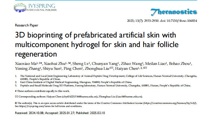 近日,我院动物多肽药物创制国家地方联合工程实验室陈海燕副教授课题组在期刊《Theranostics》(中科院一区Top,IF=12.4)上发表题为“3D bioprinting of prefabricated artificial skin with multicomponent hydrogel for skin and hair follicle regeneration”的研究文章。本研究聚焦于开发多模态响应型水凝胶支架,结合空间可控的3D生物打印技术,旨在构建具有细胞外基质拓扑特征及动态生化信号释放的仿生微环境,为实现皮肤全层结构及其毛囊、汗腺等附属器官的功能性再生提供创新解决方案。