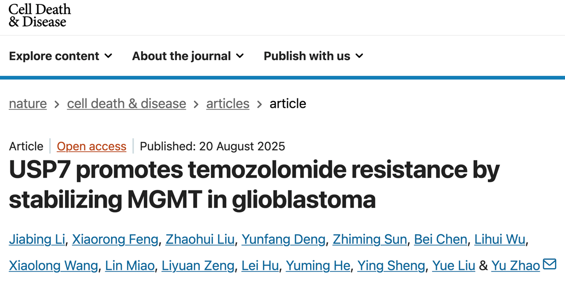 该研究是赵宇教授团队在DNA损伤修复与蛋白质泛素化调控领域长期深耕的最新研究成果。赵宇教授早在2015年便在国际重要学术期刊《EMBO Journal》上发文,首次揭示了去泛素化酶在DNA损伤修复中的非经典调控功能,并锁定USP7为其中的关键蛋白,为该领域奠定了重要理论基础。以此为基石,本次发表于《Cell Death & Disease》的研究,成功地将这一基础科学发现与脑胶质瘤这一重大临床挑战精准链接,深入阐明了USP7通过其全新靶点MGMT调控化疗抵抗的具体机制。
