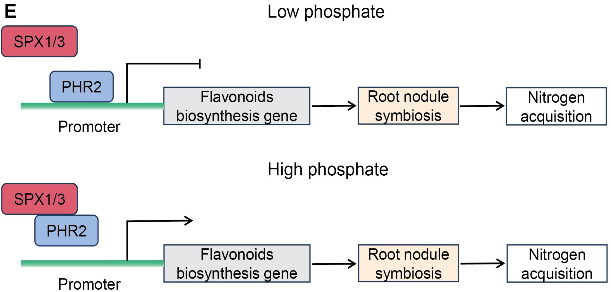 该研究揭示了SPX1/3-PHR2磷饥饿反应调控网络根据磷含量的高低控制根瘤共生水平,从而影响根瘤共生介导的氮吸收的分子机制(图1)。研究结果一方面解析了磷饥饿反应调控网络控制黄酮类化合物合成的新机制,拓宽了PHR作为转录抑制子的新功能,对后续研究其除了结合P1BS位点以外的其他调控原件提供了参考。另一方面揭示了植物调控微生物介导的氮磷吸收平衡,促进最适生长的机理,对将来更好的利用根际微生物促进植物营养吸收具有潜在的应用价值。