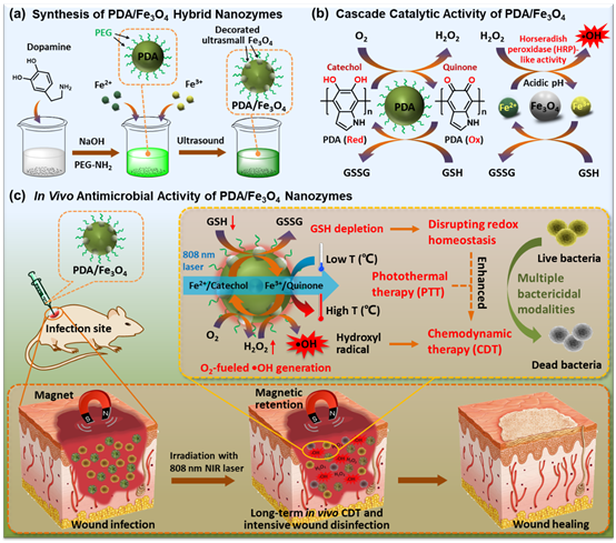 针对上述问题,何定庚教授等人开发了一种能消耗GSH和自供应H2O2的智能纳米酶,该酶不仅能打破细菌的氧化还原稳态,还能有效保留在细菌感染部位进行局部长期CDT,实现良好的抗菌效果。在该体系中,PDA/Fe3O4纳米酶的光热治疗不仅可以直接破坏细菌,而且可以提高Fe3O4类过氧化物酶活性用于CDT。 此外,PDA/Fe3O4纳米酶通过光热增强的级联催化反应,能够消耗内源性GSH来破坏细菌氧化还原稳态,同时提供丰富的H2O2促进•OH的生成,最终增强CDT的抗菌性能。这种PDA/Fe3O4纳米酶可以与细菌结合,并对金黄色葡萄球菌(Staphylococcus aureus)和大肠杆菌(Escherichia coli)显示出优异的抗菌性能。与此同时,PDA/Fe3O4纳米酶可以通过外部磁场保留在感染部位,用于体内局部长期的CDT,并且对健康组织和器官的毒性最小。这项工作提出了一种有效的策略,可以将纳米酶保留在感染部位,以实现安全、高效的CDT(DOI: 10.1002/smll.202105465)。