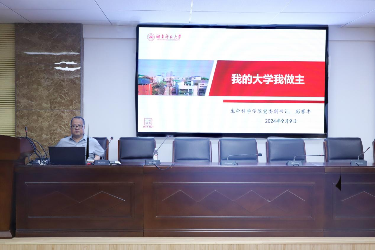 彭赛丰以“我的大学我做主”为主题,从学校及学院介绍、新生生活建议和学业指导三部分发表入学教育讲座。彭赛丰为新生介绍校史、校区、校景、校训等,并讲述生科院的师资力量和教学理念,承诺将尽力在未来的学习生活中为新生提供帮助。随后,彭赛丰向新生提出建议,要求他们乐于学习、独立思考和追求优秀。同时,彭赛丰讲述生科院2024届毕业生的升学就业情况,勉励同学们努力学习,在大学四年中不断进步,提高升学率和就业率。同学们表示,未来将不负学院老师的期望,努力学习,书写自己的人生篇章。