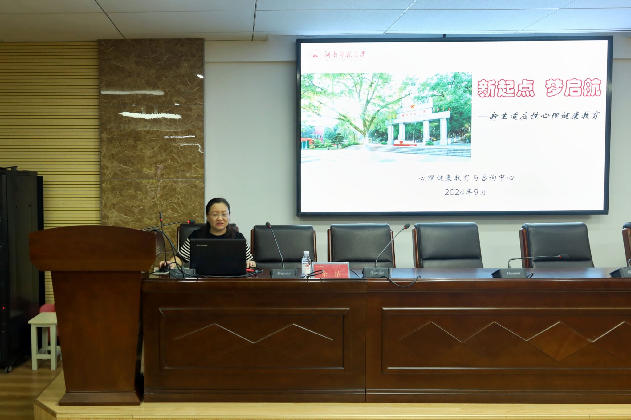 余洁向同学们介绍心理中心以及学校开设的健康课程。同时,她结合亲身经历,对新生面对大学生活可能存在的心理压力进行分析,表示在之后的学习生活中,心理压力是同学们需要克服的困难,心理中心将会与同学们一起解决问题。
