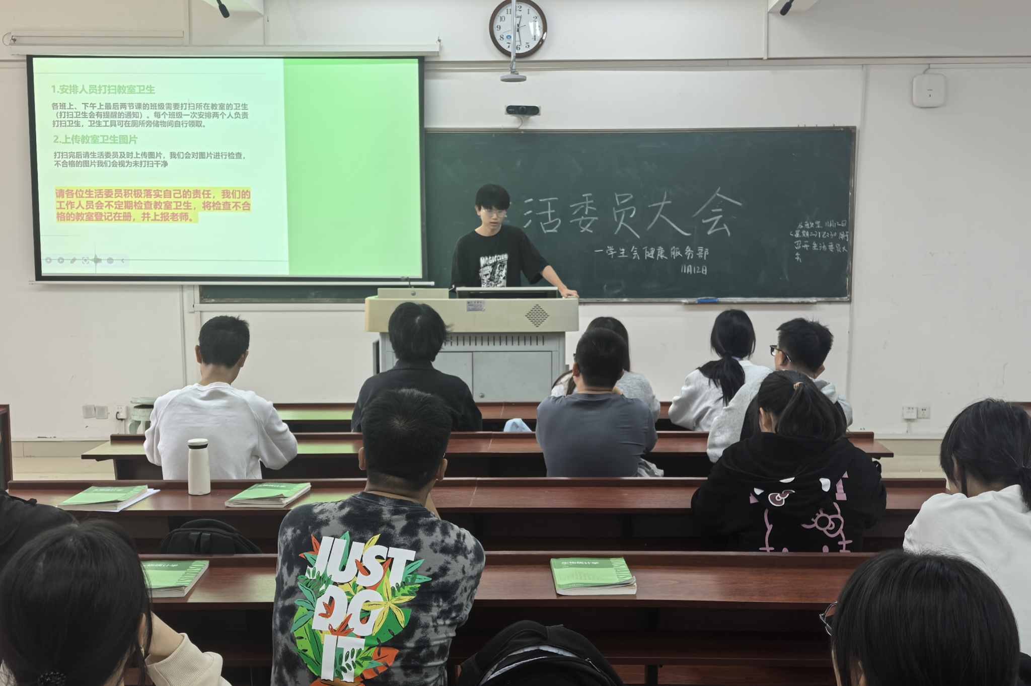 主讲人对生活委员的工作内容进行讲解,并对教室卫生打扫标准进行规范、细化和统一,要求生活委员上传照片多角度、标注化、不留死角。同时,主讲人阐明生活委员的检查规范和责任落实,以提高检查的真实性、专业性,并规范管理本班打扫任务。此外,主讲人表示院学生会健服部将通过对生活委员上传照片的评估,并结合随机抽查,监督各班级卫生打扫情况,保证教室的干净卫生。