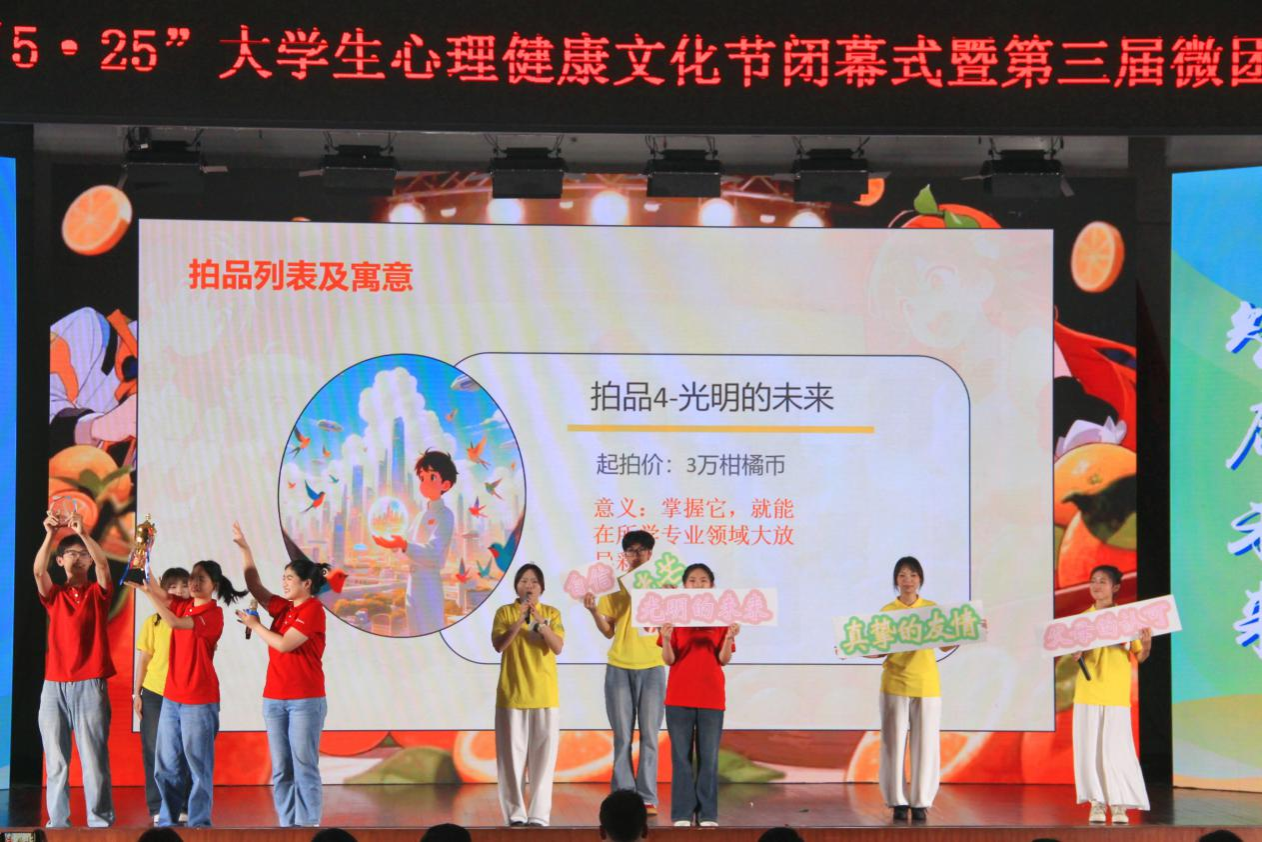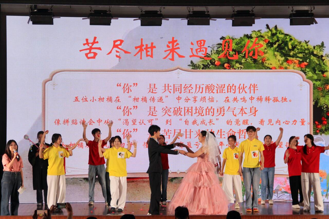 生科院微团辅队伍以学习生活中的“内耗”问题为灵感,将“内心的渴望”喻为拍品,创作了以“苦尽柑来遇见你”为主题的心理剧,展开一场关于价值追寻的深度探讨。活动中,刘迎彬和谢碧瑶引导同学们化身勇敢小柑橘战胜困难,完成了破冰、共鸣、成长、启程四个环节,在与“苦”的较量中迎来生命的回甘,同时也成功帮助柑橘仙子和她的恋人回到柑橘世界。团队与23支队伍激烈角逐,生科院微团辅团队荣获一等奖。此次活动让大家获得了直面内心的勇气,掌握了化解内耗、释放压力的方法,实现自我突破与成长。