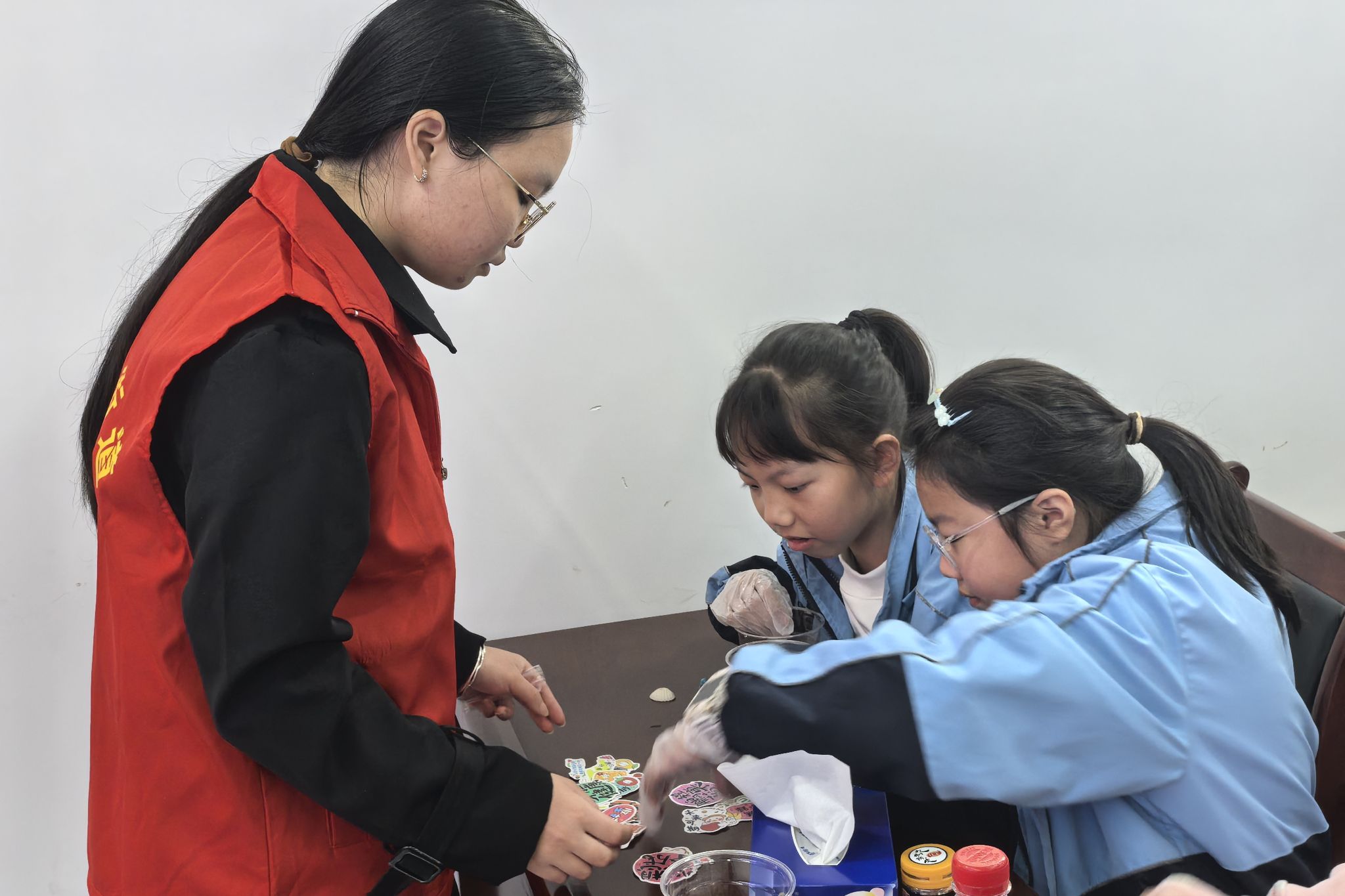 志愿者给小朋友分发贴纸