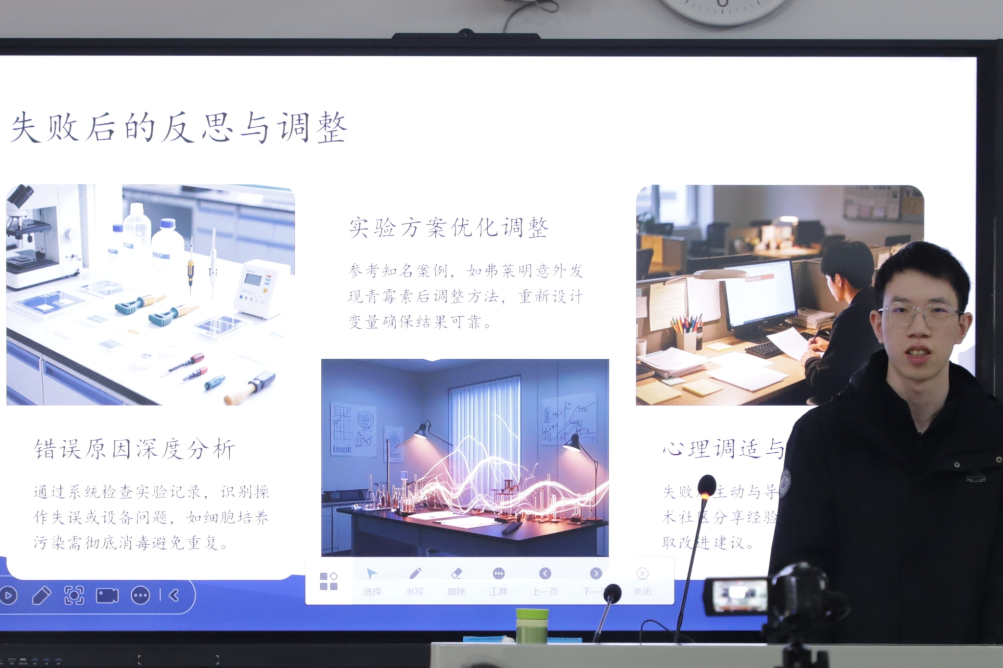 主讲人围绕“如何正确对待科研”主题展开分享,阐释科研的内涵与价值,明确科研的本质,梳理科研困难的应对策略,引导同学们认识科研、走近科研。主讲人结合自身科研实践经历,分享如何将个人兴趣与科研方向有机结合的具体做法,帮助同学们找准自身定位、明晰科研规划与学术发展方向。同时,他以大学生创新创业训练计划项目创建、核心期刊论文发表两类典型案例为切入点,围绕大创项目的立项论证、方案设计、项目实施等流程,以及论文写作中的选题构思、实验验证、论文撰写与发表等关键环节,逐一拆解科研实操要点,梳理出循序渐进、切实可行的科研成长路径,为同学们开展科研学习提供直观参考。