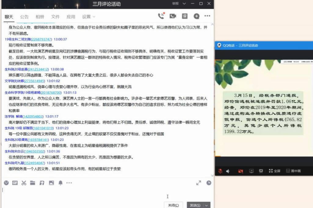 本次活动由介绍主题背景、问答互动和写作经验分享三个环节组成。喻凌峰和谢梦佳以口述、展示图片和播放视频的方式向评论员介绍了冬残奥会上运动员的感人事迹和娱乐圈艺人偷税漏税事件。主持人喻凌峰和谢梦佳聚焦当前热点,带领评论员们了解残奥会上的励志故事,引导评论员积极分享对运动员百折不挠精神的感悟。同时,他们分析艺人偷税漏税的原因,总结了应对艺人犯法的相应措施。生科院评论员李婷认为,身有残缺的运动员以不屈的毅力挑战自己并超越了生命的极限,赢得社会的尊重,而所谓“男神”被金钱蒙蔽双眼,对法律怀有侥幸心理而偷税漏税,丢失自身的底线。两相对比,更显清人之愈清,浊人之愈浊。