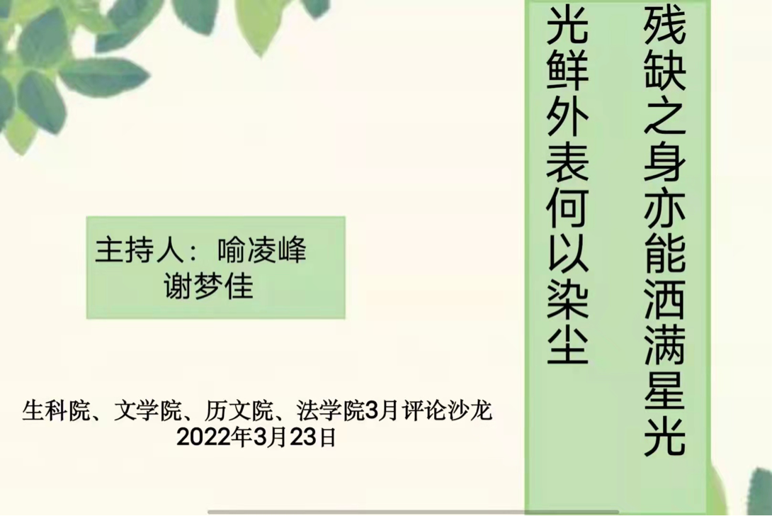 (通讯员 郑素颖)3月23日,生科院、历文院、文学院和法学院于线上联合举办“残缺之身亦能洒满星光,光鲜外表何以染尘”1+1评论会。法学院评论部成员喻凌峰和谢梦佳担任主持人。