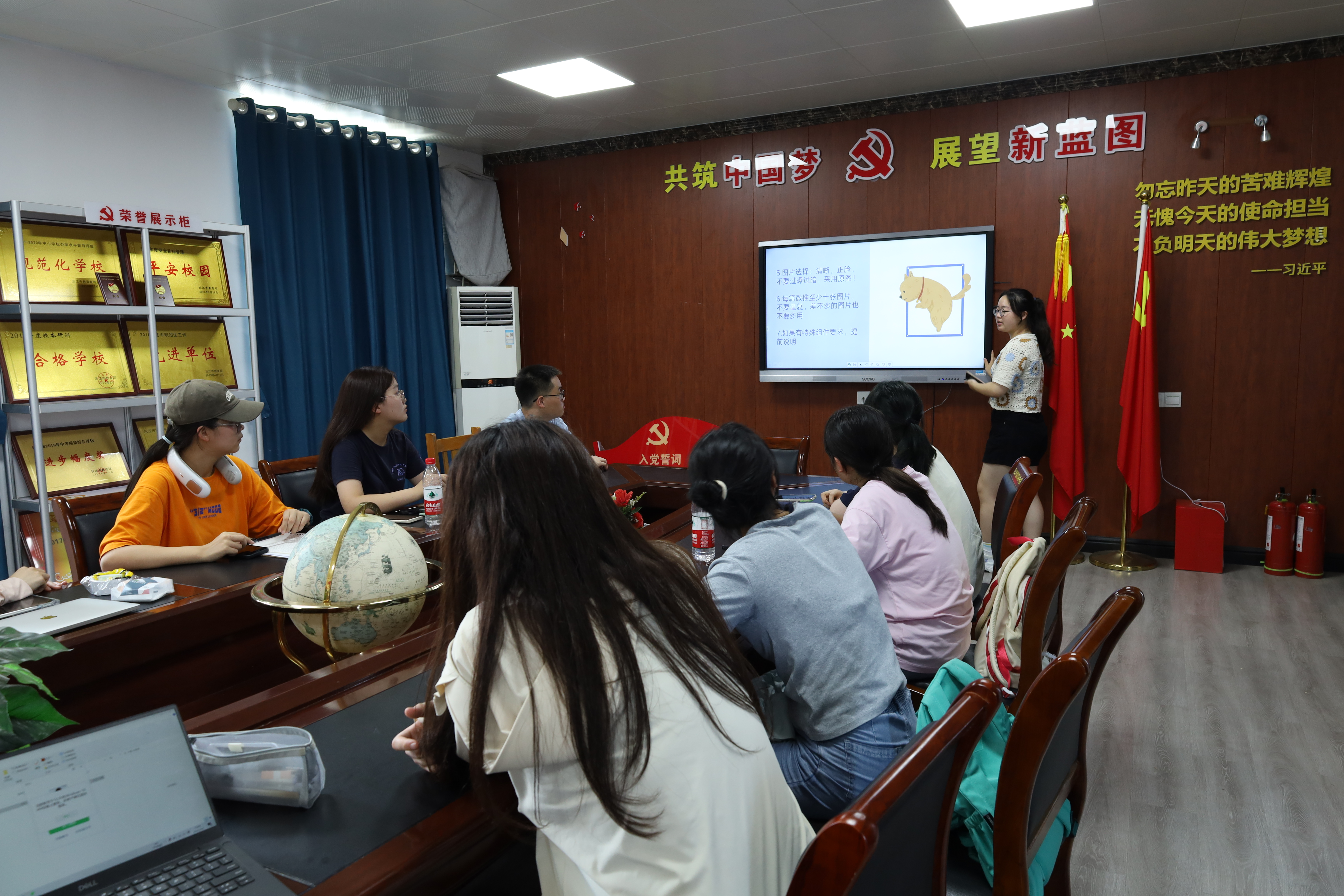 此次会议分为新闻撰写培训及微信推送培训两个部分。李宇轩以2023年暑期三下乡投稿须知文件要求为基础,侧重于讲解标题、图片、正文的要求,强调撰写新闻用词应妥当、格式需规范。她提醒大家新闻具有时效性、真实性以及准确性,并表示希望后续的新闻撰写更加标准。廖童从微推内容要求、审核要求以及时间观念三方面进行详细讲解,她希望团队成员丰富微推内容,在规定时间内完成微推的撰写、审核、投送程序。