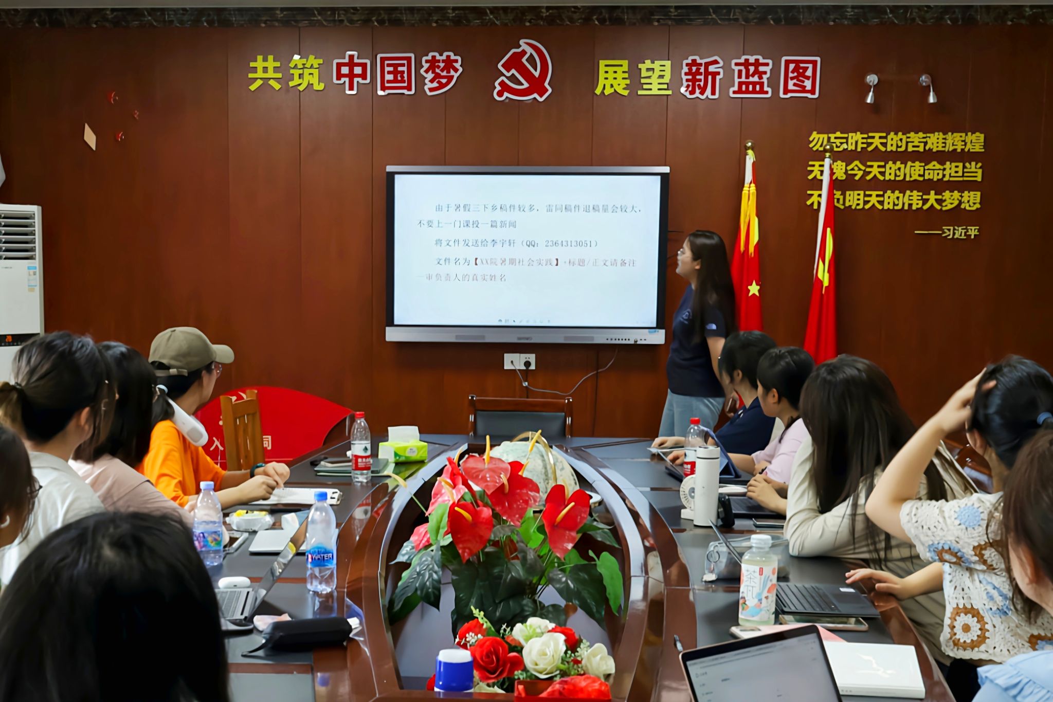 此次会议分为新闻撰写培训及微信推送培训两个部分。李宇轩以2023年暑期三下乡投稿须知文件要求为基础,侧重于讲解标题、图片、正文的要求,强调撰写新闻用词应妥当、格式需规范。她提醒大家新闻具有时效性、真实性以及准确性,并表示希望后续的新闻撰写更加标准。廖童从微推内容要求、审核要求以及时间观念三方面进行详细讲解,她希望团队成员丰富微推内容,在规定时间内完成微推的撰写、审核、投送程序。