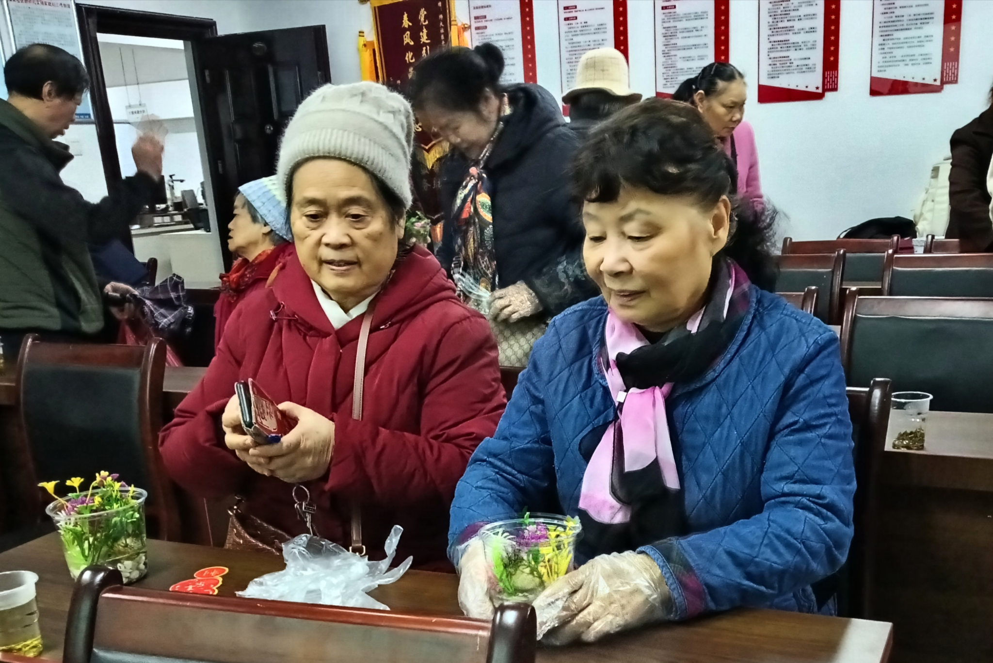 主讲人以音乐和水仙花传说引出活动主题,并从水仙花的花语、颜色、种植事项三个方面科普了水仙花的相关知识。主讲人以有奖问答的形式鼓励老人们参与讨论种植经验,老人们分享自己的种植经历,随后志愿者们为老人们分发手绳、香囊和冰箱贴等小礼品。手工实践环节,志愿者们提前准备好装有五花石的咖啡杯,在讲解结束后给每一位老人分发水仙花种球、假花和贝壳等材料,协助老人们完成水仙花水培作品。老人们表示,水培水仙花很有趣,制作水仙花水培作品增加了他们对这种植物的认识。