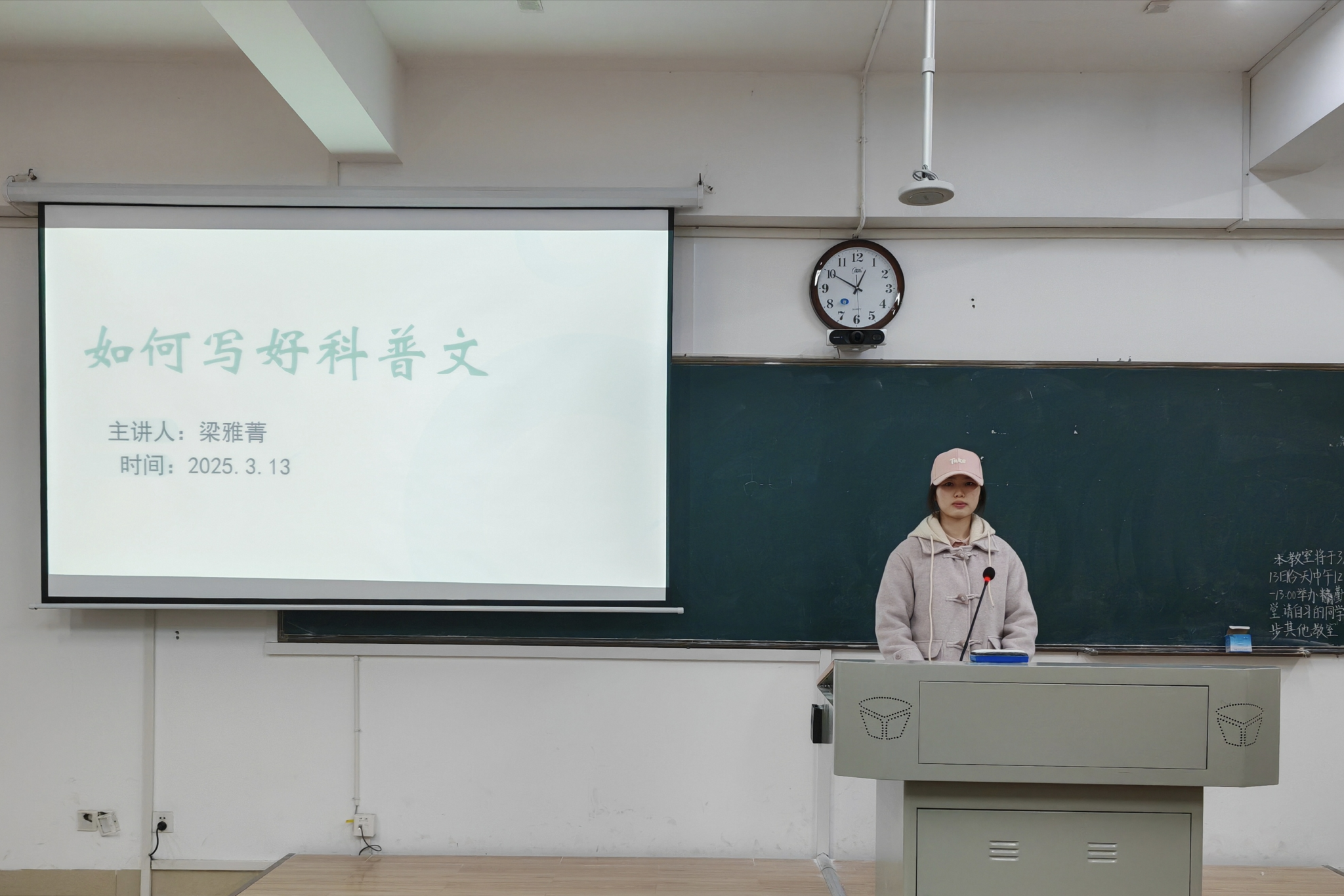 梁雅菁为同学们讲解了科普与科学的边界及科普的目的,解析生物学科普的底层逻辑,分享科普文写作方法,为同学们的科普文写作打下基础。梁雅菁结合自身经历,讲述了在开展生物科普活动时,如何通过生动有趣的实验和互动游戏,让孩子们对生物学产生浓厚的兴趣。梁雅菁还分享了自己在大创课题申报过程中的心得体会,为同学们将来参与大创课题申报提供了有益的参考。