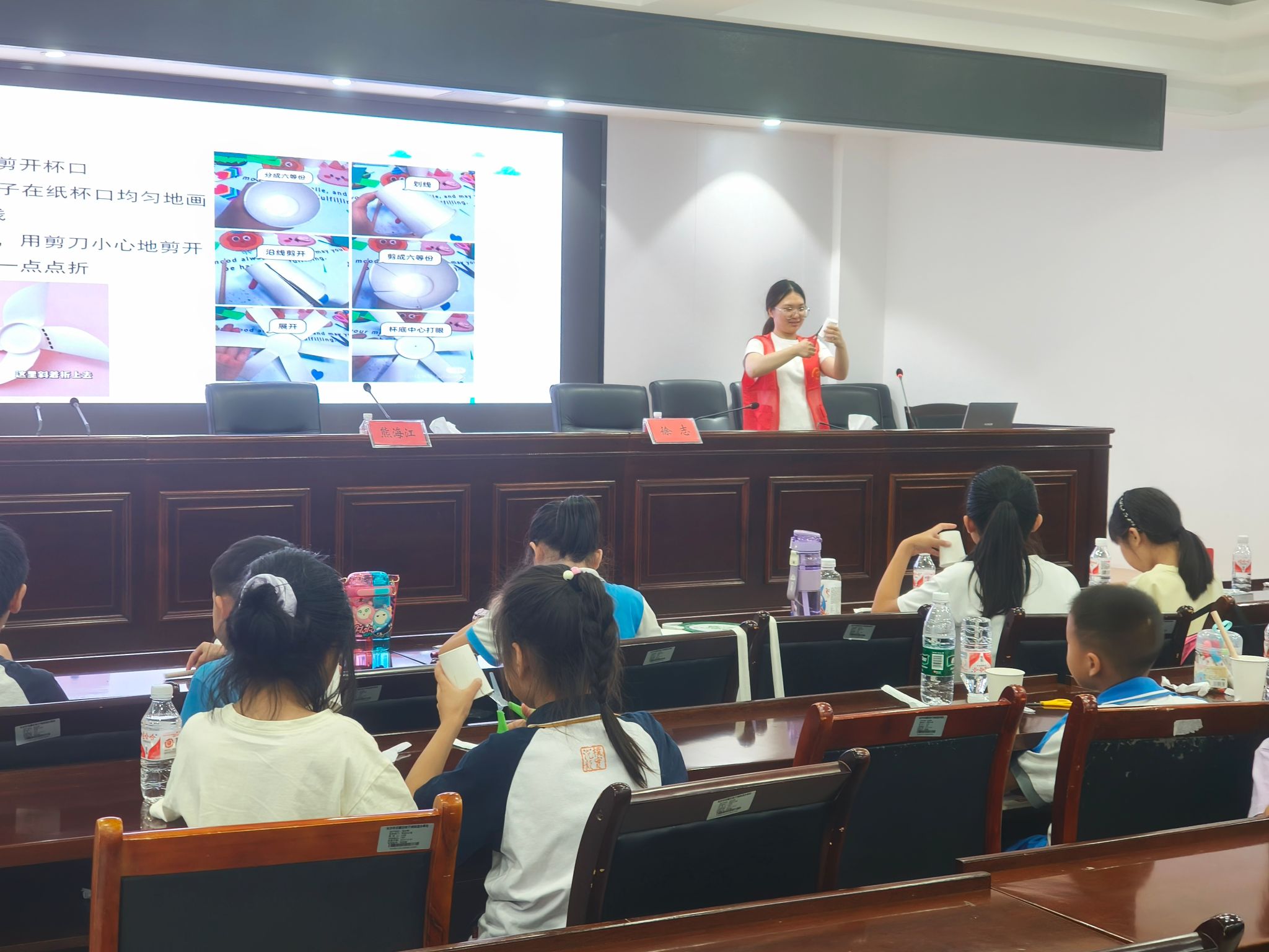 史文希向学生们讲述风车的常见种类及其功能,并结合小视频向同学们讲解风车能被风吹动的原理,激发起同学们对风车的兴趣。在志愿者分发纸杯、纸吸管、水彩笔、剪刀以及棉签等手工材料后,史文希和戴睿向同学们详细讲解手工风车的制作方法,其他调研员成员一同协助活动开展,帮助同学们完成手工。在手工制作环节,同学们剪纸杯,画图案,安装连接纸吸管、牙签与纸杯,制作具有独特风格的风车。制作完成后,同学们用自己制作的风车进行吹风车比赛。