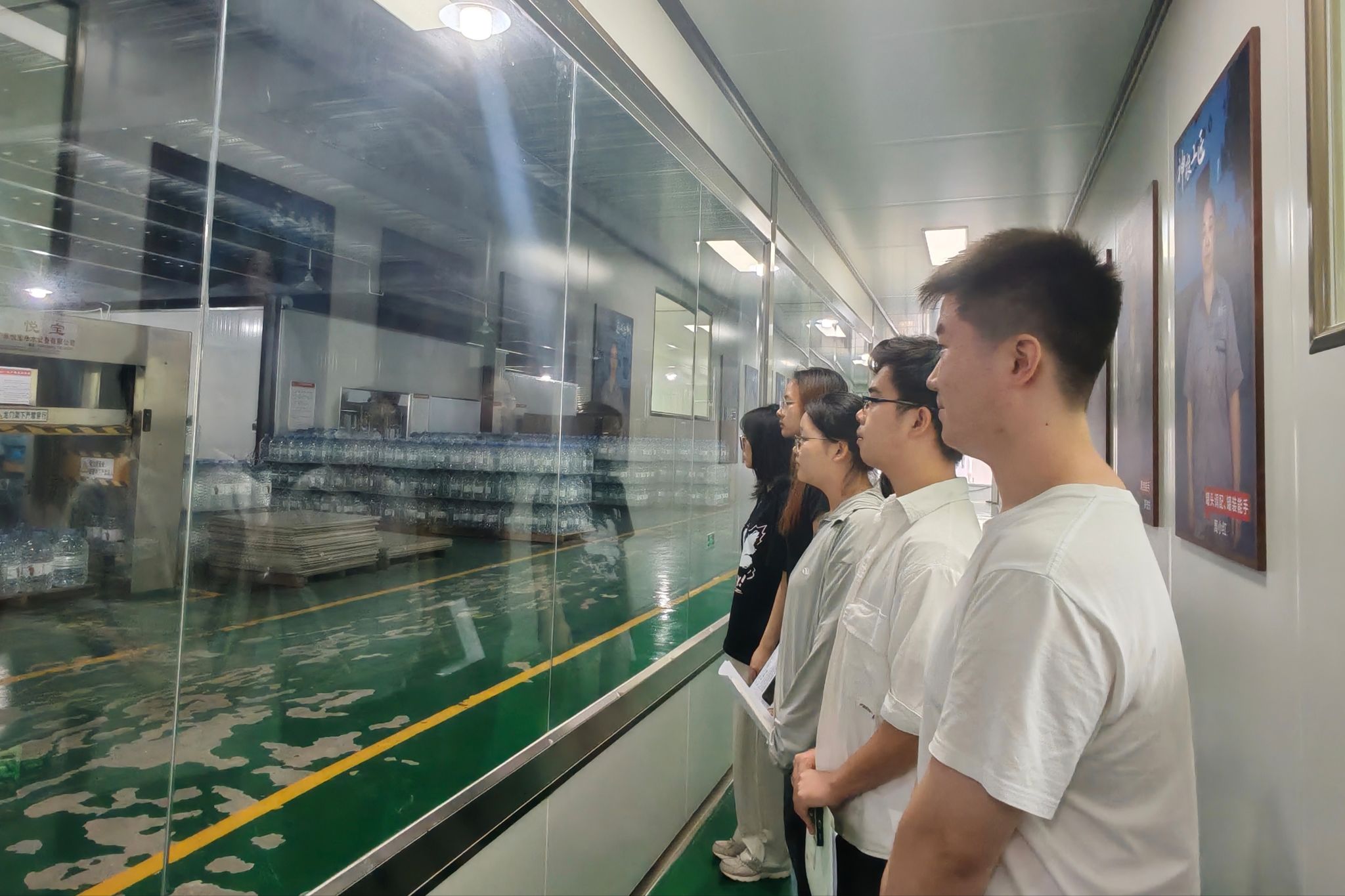 技术人员向实践团介绍,该公司采用"公司+农户+合作社"的原材料收购模式,主要生产原浆、黄桃汁、矿泉水、茶饮料和果脯五大类产品。产品以株洲地区为主要销售市场,通过"线上+线下"双渠道销售。在研发方面,技术人员讲解"1+2"研发模式,由炎陵研发中心、广州研发中心联合部分高校实验室共同开展研发工作。同时他指出,公司研发的"双桃罐头"产品采用脱色黄桃青汁作为汤水加黄桃的工艺,该产品在2024年长沙中部农博会上获得"产品金奖"。随后,在技术人员的带领下,实践团前往公司矿泉水包装车间了解神农福泉矿泉水的产品种类和参观其包装流程。据车间人员介绍,神农福泉矿泉水专供给企业会议、银行等机构,采用双向选择模式。