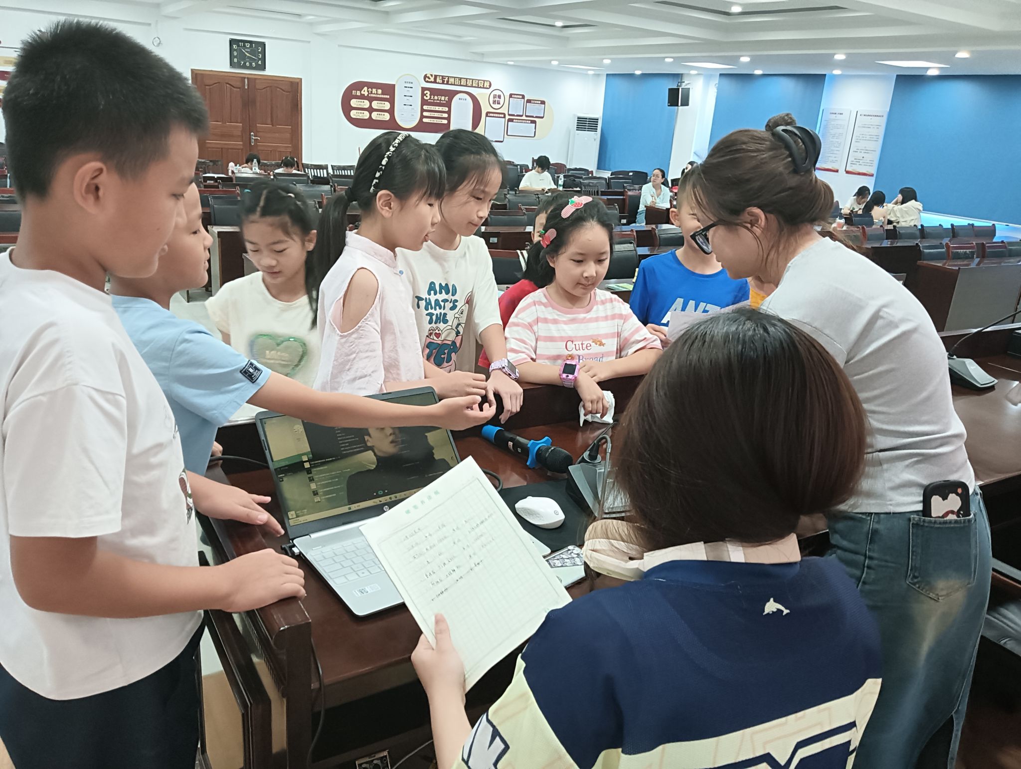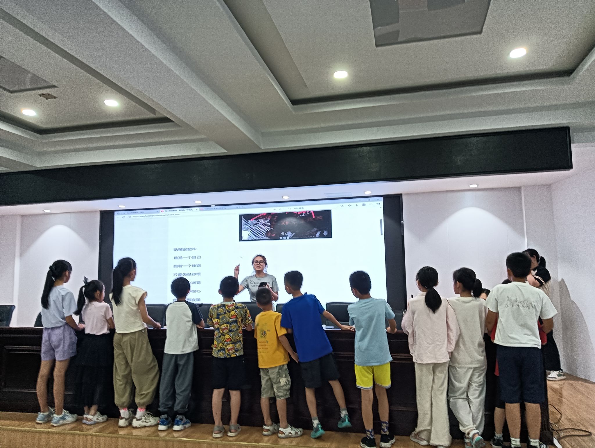 活动伊始,主讲人组织同学们通过抽签确定彩排上台顺序。同学们按组别依次登台进行彩排演练。主讲人全程关注台上小朋友的表现状态,针对节目效果提出优化建议,助力提升节目质量。实践团其他成员协同配合,负责维护现场秩序,保障彩排活动有序推进。在诗歌朗诵练习环节,小朋友认真跟读和朗诵屏幕中《再别康桥》的文稿内容。随后,进入大合唱练习环节,志愿者指导小朋友调整音高和音准,小朋友们的歌声在伴奏中整齐响亮。小朋友们均以认真积极的态度参与彩排,反复练习歌曲唱词与诗歌篇目。彩排活动结束后,小朋友们信心倍增,对即将到来的结营仪式满怀期待。