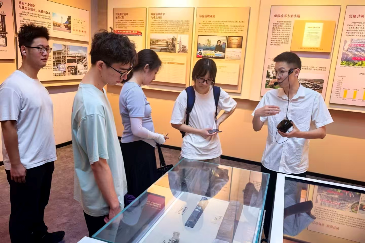 实践团成员在讲解员刘一粟的引导下,开启对水口山地区金属开采冶炼史的系统调研。成员们聆听讲解,通过实物展品、历史图片和文字资料,全面梳理水口山3000余年的矿冶发展脉络。在洋务运动时期历史展区,实践团阅读相关文献记载,了解水口山收归官办并设立矿务局的背景,以及由此开创的多项近代矿业先例。走进工业遗址展区,成员们实地观察中国首个机械提升矿井的遗址原貌,研究首座西法炼铅厂的设备复原模型。在特种材料展示区,成员们了解水口山产出的铍材料在“两弹一星”及航天工程中的应用细节,对获得全球认可的SKS商标产品相关资料进行了收集整理。面对环境治理展区的图文介绍,实践团成员询问长期过度开采导致的空气与地下水污染情况,重点记录了近年来当地关停污染企业、实施生态修复工程的具体措施,对水口山在“绿水青山就是金山银山”理念指导下实现的生态转型路径展开深入探讨。