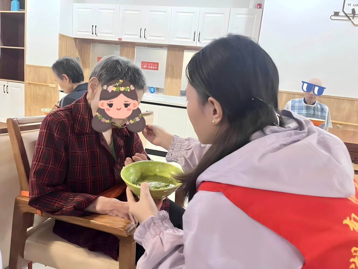 志愿者协助老人用餐