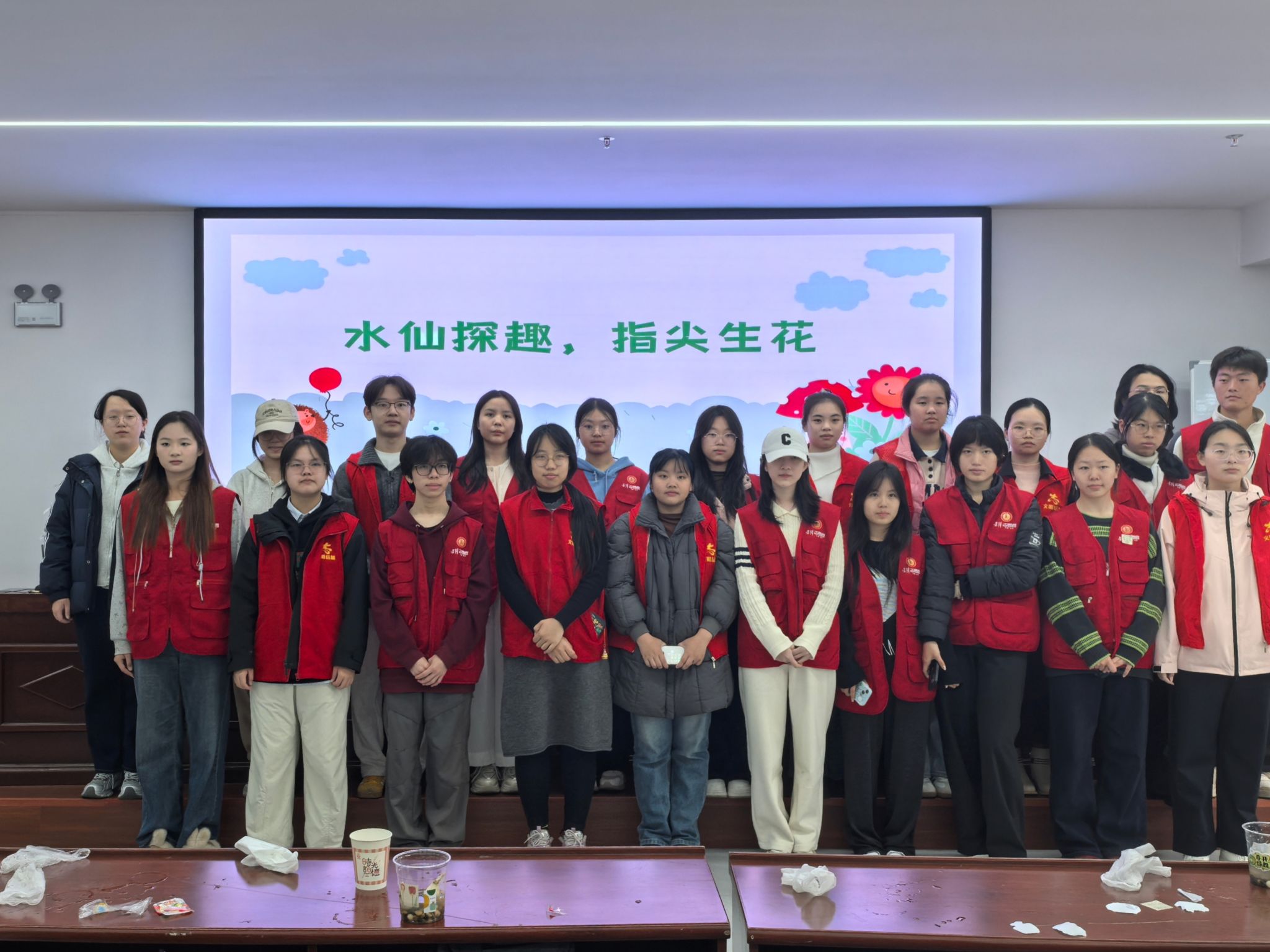 活动开场,主讲人通过播放水仙主题音乐及展示五元纸币上的水仙元素,让小朋友对水仙有了初步认知。核心科普环节中,主讲人以“水仙小课堂”形式,介绍水仙的花色特点、香气特质及“纯洁吉祥”的文化寓意,让小朋友了解水仙的生物特性与文化内涵。实践操作环节,志愿者分组协助小朋友进行水仙栽培从花盆装饰,并讲解水仙碱的安全防护知识与日常养护中的换水频率、环境通风等要点,确保小朋友们掌握完整、安全的水培技能。