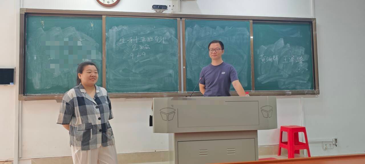 生科五班于生科院101教室举行班导师见面会,班导师王泽峰、黄骊群详细介绍班级管理、学业规划等相关事宜,并与同学们互动交流,为同学们解答大学生活与学习的疑惑,使同学们对导师有了更加全面的认识,对大学生活充满了憧憬。