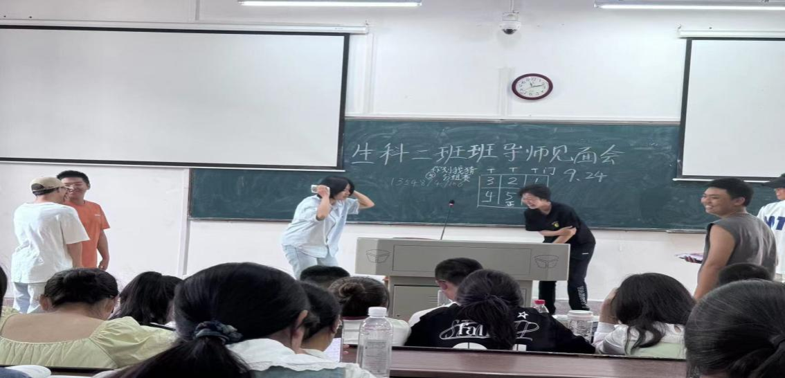 生科二班班导师刘吉简单自我介绍,并对同学们提出的如考研等一系列问题进行了解答,让同学们对大学生活有了初步的了解。随后,全体成员进行小游戏,加强班级文化建设。