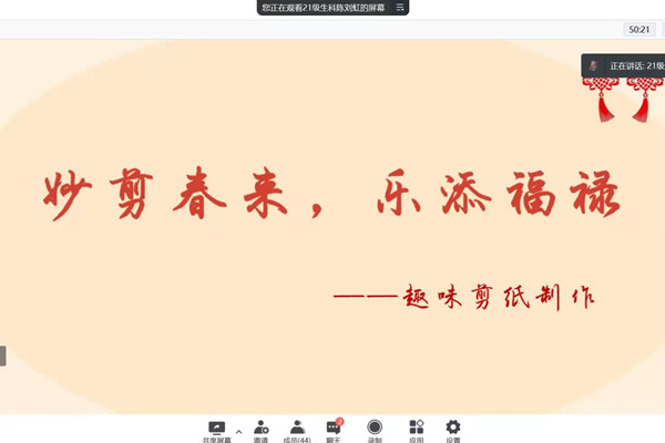 此次活动分为活动介绍、剪纸展示、制作讲解和线下创作四个部分。陈刘虹通过文字和图片向会员展示了多种精美的剪纸,并以“春”字剪纸为例向会员详细地讲解了剪纸的制作步骤。会员们线下开始制作特色剪纸。