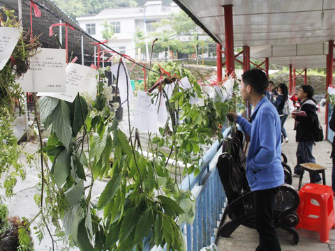 黎维平、刘应迪带领同学们进行了植物标本的采集工作。一路上,老师向同学们仔细介绍了各种植物的特征性状。途中同学们利用高枝剪、铲子等工具采集了包括金银花、映山红、绣线菊在内的四十多种植物。采集后,同学们来到水上长廊进行植物标本制作、检索、植物挂牌的学习。经过黎维平老师的详细讲解后,同学们纷纷拿出自己采集的植物开始动手制作标本。利用《中国植物图鉴》、《种子植物学野外实习指导》等资料,同学们两人合作进行植物的检索与挂牌。各组员之间配合默契,很快长廊两侧的植物都被挂了牌。