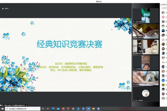 (通讯员 黄依文 郭英美)5月28日下午,伟德国际victor1946读书协会、暖阳生物学社、三叶草园艺社、达人学社、小微公益社、伟德bv1946图书馆、文学院梨轩戏曲社与新闻与传播学院MIC主持人俱乐部于线上举办伟德bv1946第三届麓山阅读马拉松挑战赛第四程活动“经典知识竞赛”。小微公益社理事王梓楹担任此次活动主持人。