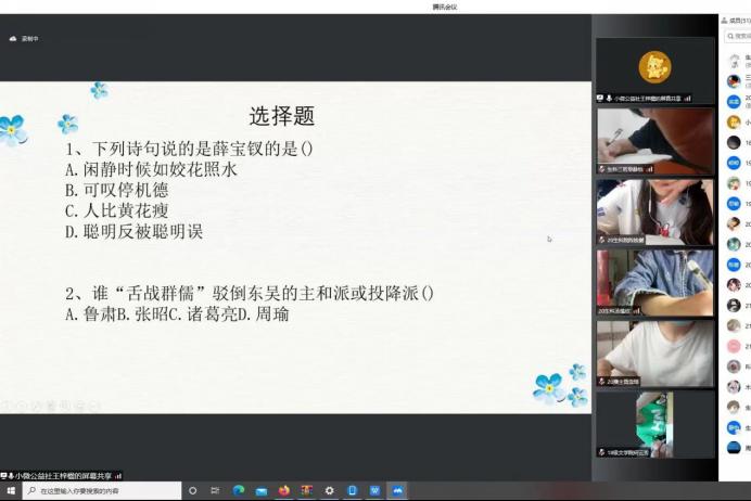 此次活动由活动内容介绍、参赛者作答、结果统计与公布结果四部分组成。王梓楹向参赛者介绍活动内容,35名参赛者打开摄像头做好答题准备。主持人通过ppt播放题目,参赛者用草稿纸作答。参赛者在限定时间内填好发放的问卷。最后相关工作人员统计结果并宣布结果,获奖同学合影留念。