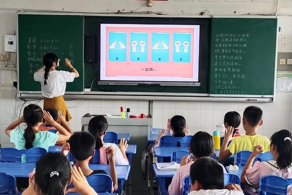 此次活动仅在五年级开展,分为老师示范活动内容、学生自主练习以及结果展示三个部分。王乐怡为学生示范手势节奏舞的动作要领,与学生一同练习手势动作。学生自主练习,完成手势节奏舞的学习,并进行结果展示。老师为学生摄影拍照留念。