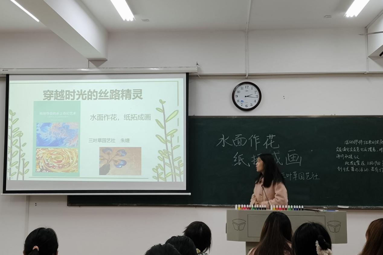 (通讯员 伍鼎载 谭莎莎)11月19日下午,伟德国际victor1946三叶草园艺社于生科院B108教室举办“水面作花,纸拓成画”手工活动。生科院三叶草园艺社理事朱婕担任此次活动主讲人。