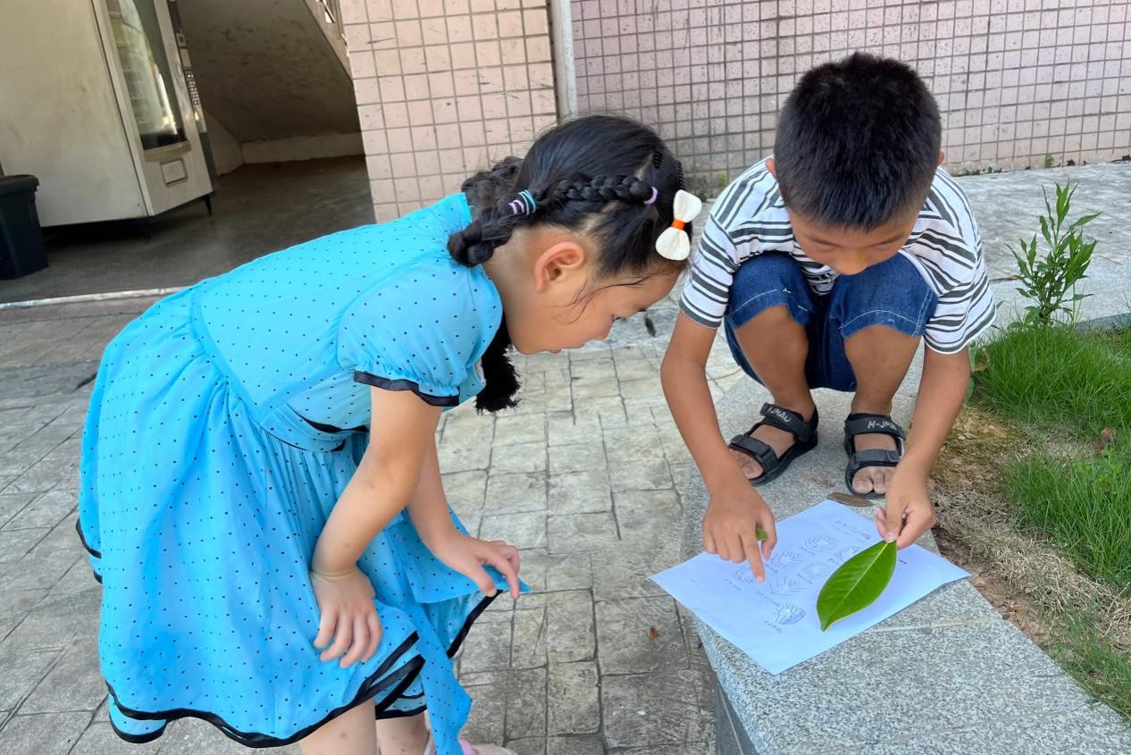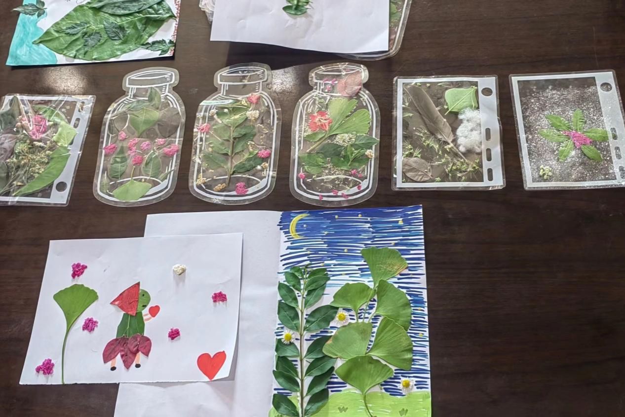 此次课程在一年级、二年级、五年级开展,包括户外植物识别课程、创意粘土课程以及创意植物拼贴绘画课程。王妍和梁雅菁向学生讲解植物叶片的基本组成和形态图,分发寻找叶形、叶脉、叶缘的任务卡,带领学生在户外进行叶片的识别与采集。曹惊姿在课堂上展示不同的创意模型和制作特点,进行同步教学和分组练习,鼓励学生动手制作趣味模型,集中展示成果,培养学生动手能力和团队协作能力。金雪儿和杨岱霏带领五年级学生采集植物叶片、花朵等材料,引导学生观察不同植物形态特点,鼓励其结合绘画、剪纸自主设计并创作创意手工作品。