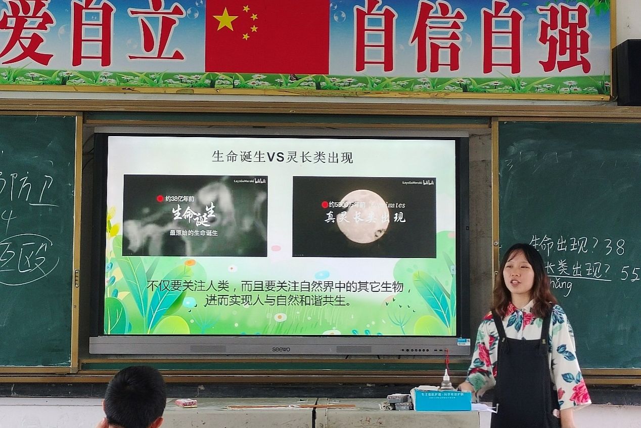 何敏借助一些具有典型特征的动植物和各种鸟类的婚礼向同学们讲述了生物的共性,让同学们了解到了生物的多样性和奇妙之处,激发了同学们的对动植物世界的兴趣。何敏鼓励同学们分享自己喜欢的动物,并呼吁大家关注各类动物,促进人与自然和谐共生。同时,她借助中国的国花与湖南省的省花激发同学们对乡土植物的情感和认同,为提高学生的参与度,何敏设置了猜花称号的游戏,同学们积极与老师进行互动,在游戏中学习到更多的知识。