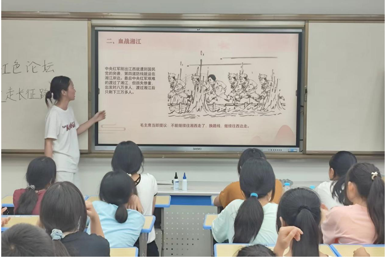 此次活动的主题为“重走长征路——追寻红色记忆,传承红色精神”,分为讲解历史背景、漫说长征、阐述长征精神三个部分。李欢以郴州特色红色故事——“半条被子”引入红军长征的主题内容,并播放视频讲解长征的基本路线、长征路上各重要地点及相关战役。李欢强调了遵义会议的重要历史意义和长征精神对现在人们生活的重要作用,并以微视频《在场》告诫学生们现在的生活来之不易,且行且珍惜。
