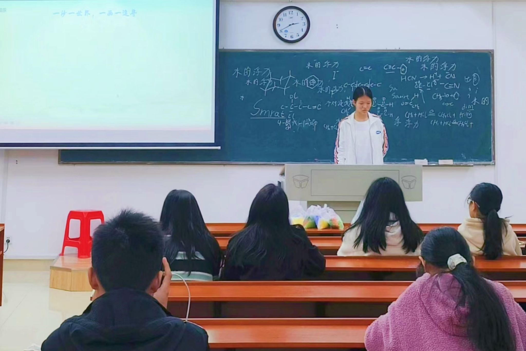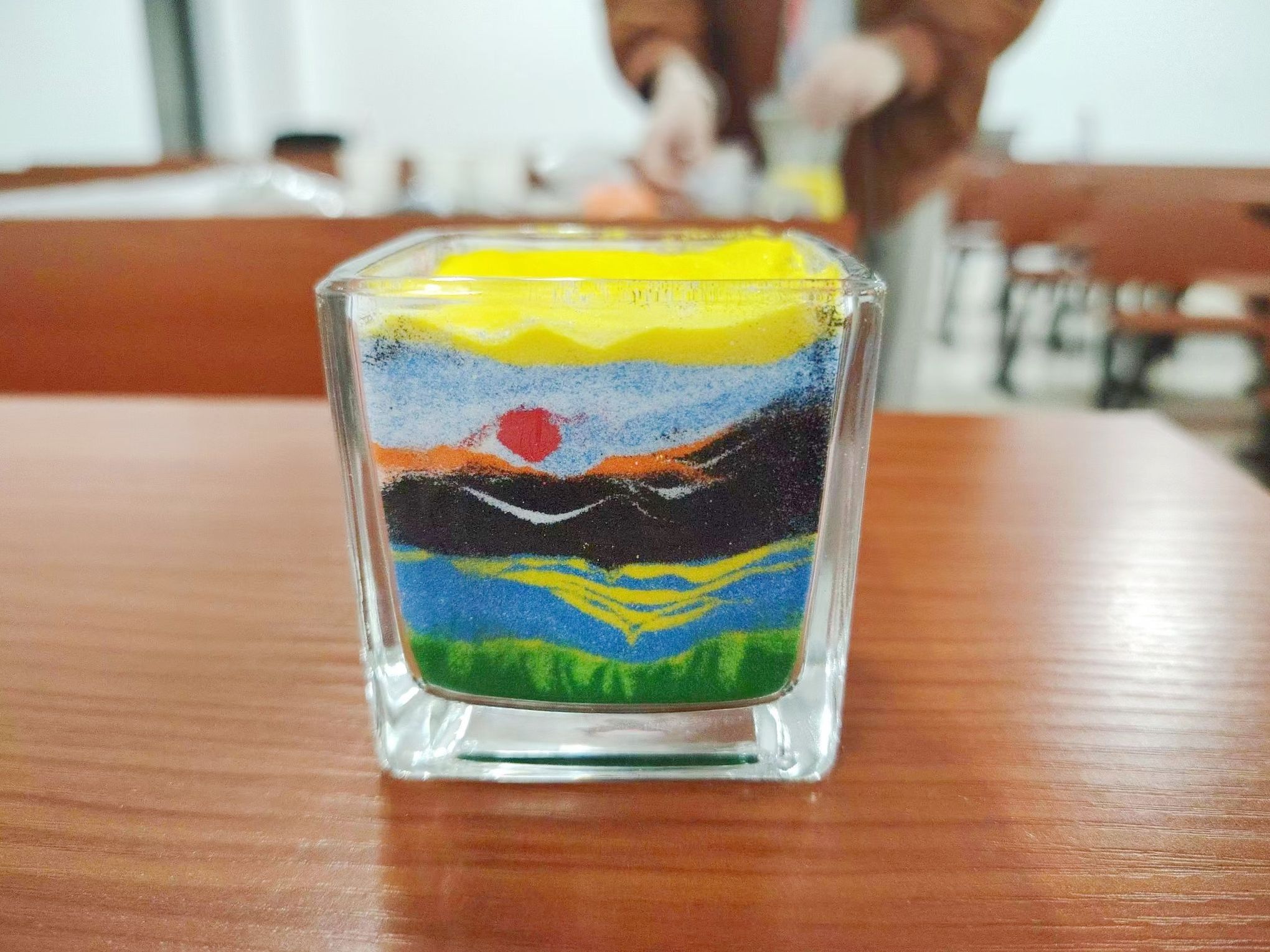 本次活动分为制作方法讲解和动手创作两个部分。主持人借助PPT向同学们介绍此次活动流程,并指导同学们领取材料。她以视频教程为例,借助现场材料详细说明沙画蜡烛的制作方法。同学们在主讲人的带领下,利用彩砂、玻璃杯、蜡烛芯等材料,创造出自己喜欢的蜡烛图案及沙画作品。同学们相互交流经验,帮助彼此修改作品,进行拍照留念。主持人表示此次活动着眼于现代新颖的手工方式,将沙画与日常生活中的用品巧妙结合,是三叶草社团的一次创新与突破。