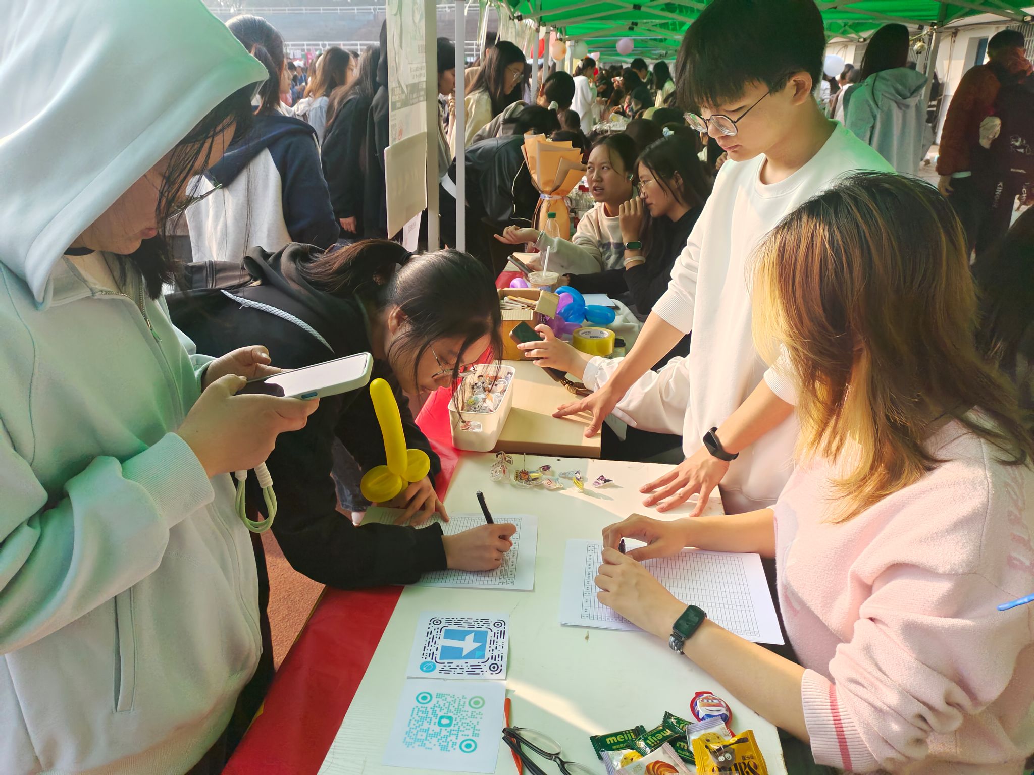 “百团大战”由社团摊位特色活动和舞台节目表演两大部分组成。在舞台环节,各社团带来了精心编排的节目,展现了各自独特的魅力。生科院学社管主任赵琳慧代表学院,与其他学院的学社管主任共同演绎了会歌《青春舞台》,赢得了现场观众的热烈掌声。此外,生科院的五个社团还通过一系列丰富多彩的互动体验活动,吸引了大量同学驻足参与。达人学社的投壶游戏与成语猜谜、暖意生物学社的手工染色卡和折纸星星、三叶草园艺社的套圈游戏和植物印画、科幻动漫协会的舞蹈表演与图画猜词,以及小微公益社的创意扭扭棒制作。活动期间,各社团积极地向来访者介绍社团特色,耐心地解答疑问,极大地促进了社团的招新效果。吴晴和罗静伟两位老师也深入各个摊位,对招新工作提出了宝贵的指导意见,鼓励同学们勇敢追求自己的兴趣爱好,丰富大学生活。
