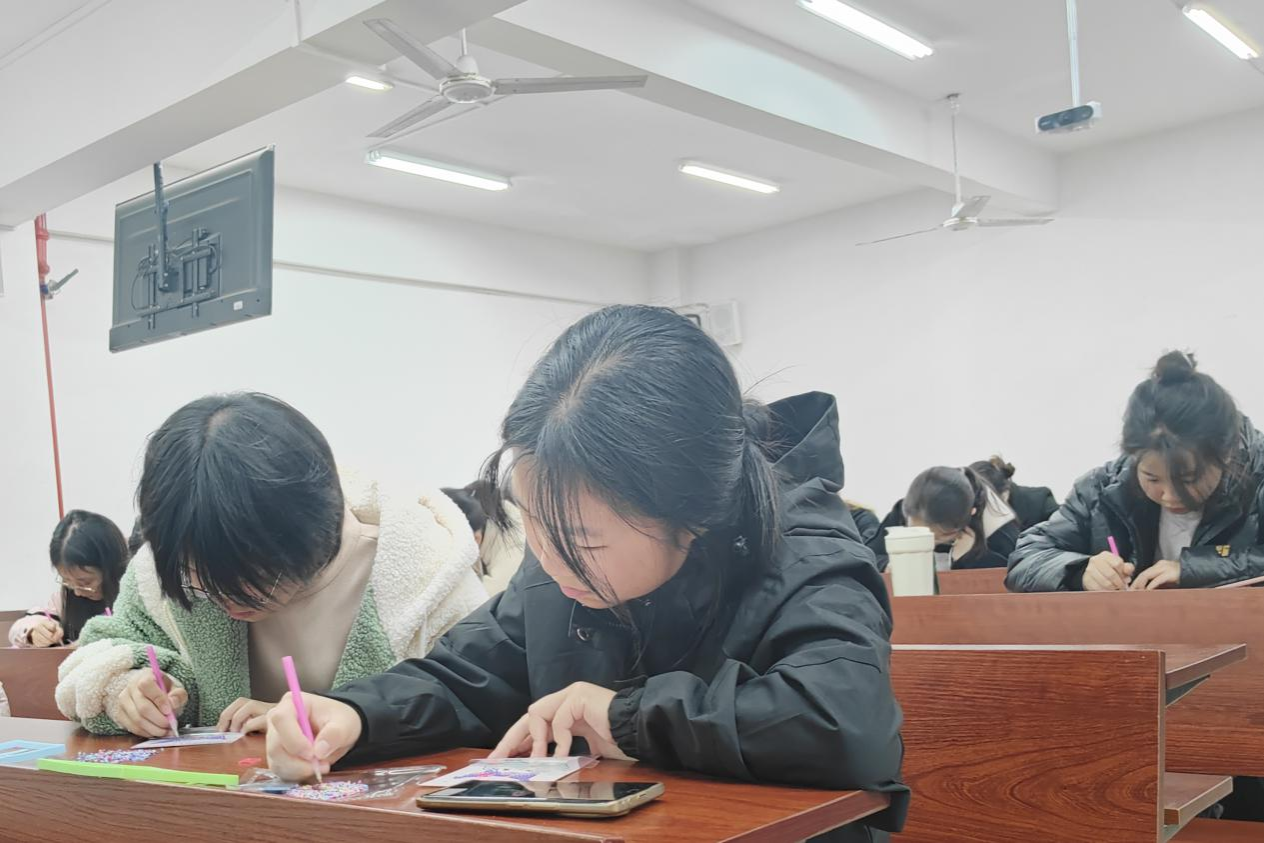 此次活动包括钻石画背景介绍、手工创作和成果展示三个环节。吴慧艳向同学们介绍钻石画的起源、定义及制作方法,她解释钻石画起源于19世纪的欧洲,最初是作为贵族的装饰品,后来逐渐演变成一种流行的手工艺品。钻石画的制作过程包括准备材料、解读画布、粘贴钻石和整理包装四个步骤。同学们在主讲人的带领下,挑选钻石粒,将其粘贴在画布上,并不断调整位置以确保作品的美观和整齐。经过数小时的制作,一幅幅钻石画作品逐一呈现,同学们将作品进行分享展示,并交流钻石画创作的心得和体会。