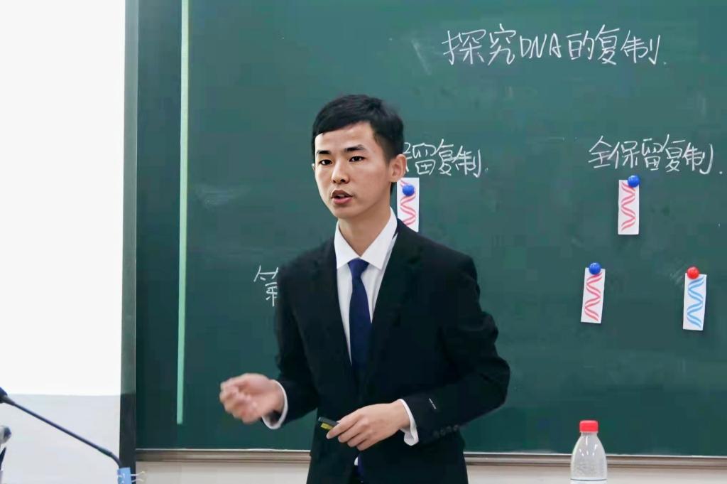 事事总是环环相扣,支教的经历带给了李绵龙实践教技的机会,随后的微格课程又让他了解并完善自己在教学技能方面的不足。在此期间,他同时准备着生科院师范技能大赛。那段时间,他积极进行备课训练,认真撰写教案,完成每周的教学课题,还会在集体内互相“磨课”,彼此提出建议,反复修正、精炼教学语言,控制好教学的时间。他心怀教育梦想,所以不曾止步。在日复一日的训练和一次复一次的修正下,李绵龙终脱颖而出,如愿以偿地进入了决赛,获得了代表院里参加校师范技能大赛的机会。备战校赛期间,在老师的指导和帮助下,李绵龙也不负众望,取得伟德bv1946第六届师范生技能大赛二等奖。