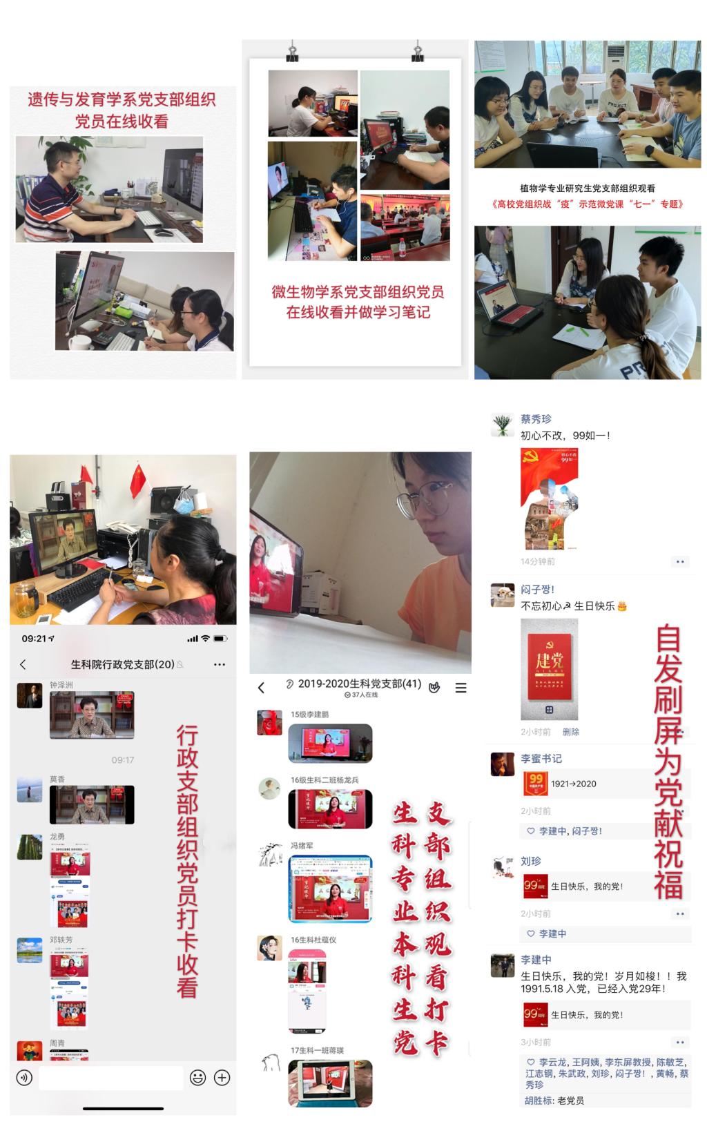微生物学系党支部、遗传与发育学系党支部、行政党支部、植物学专业研究生党支部、生物科学(师范)专业本科生党支部等教职工和学生党支部组织党员在线收看微党课,以教育激发党员的担当意识和责任意识,继承和发扬党的光荣传统和优良作风。