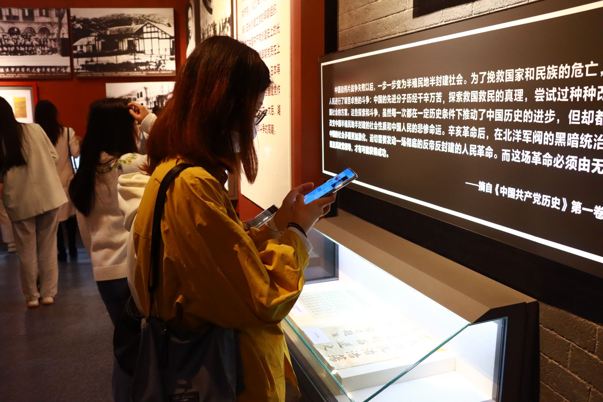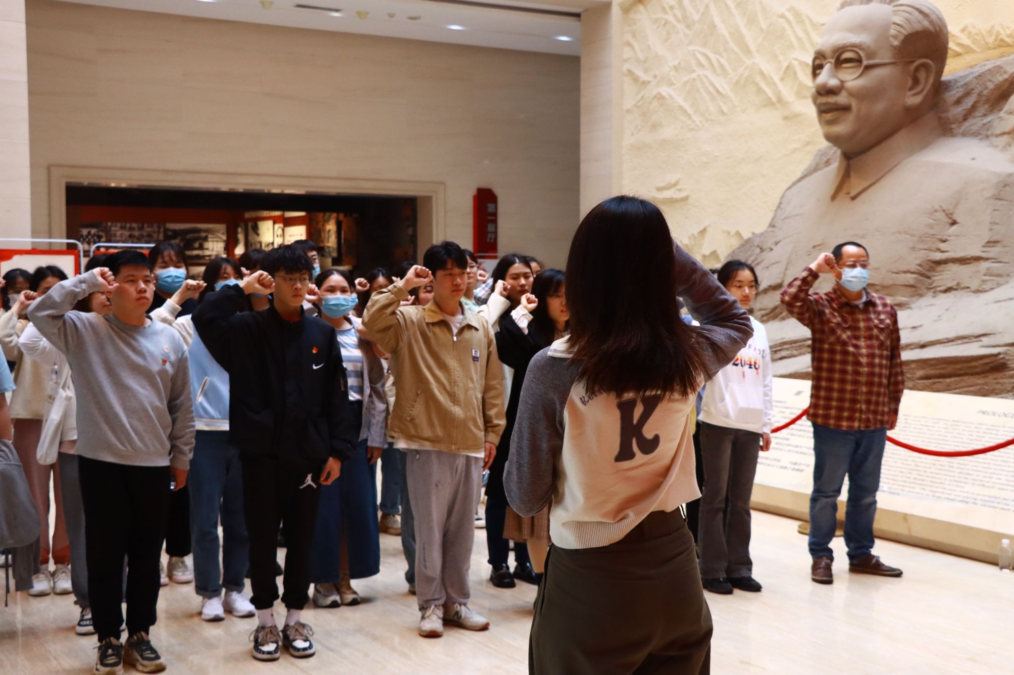 湖南党史陈列馆以“敢叫日月换新天”为主题主题,陈列着“潇湘魂”的任弼时、毛泽东、刘少奇三位伟人的半身雕塑。面向伟人雕像、党旗,冯孟哲同学领誓,党支部的成员举起拳头,再次重温入党誓言。